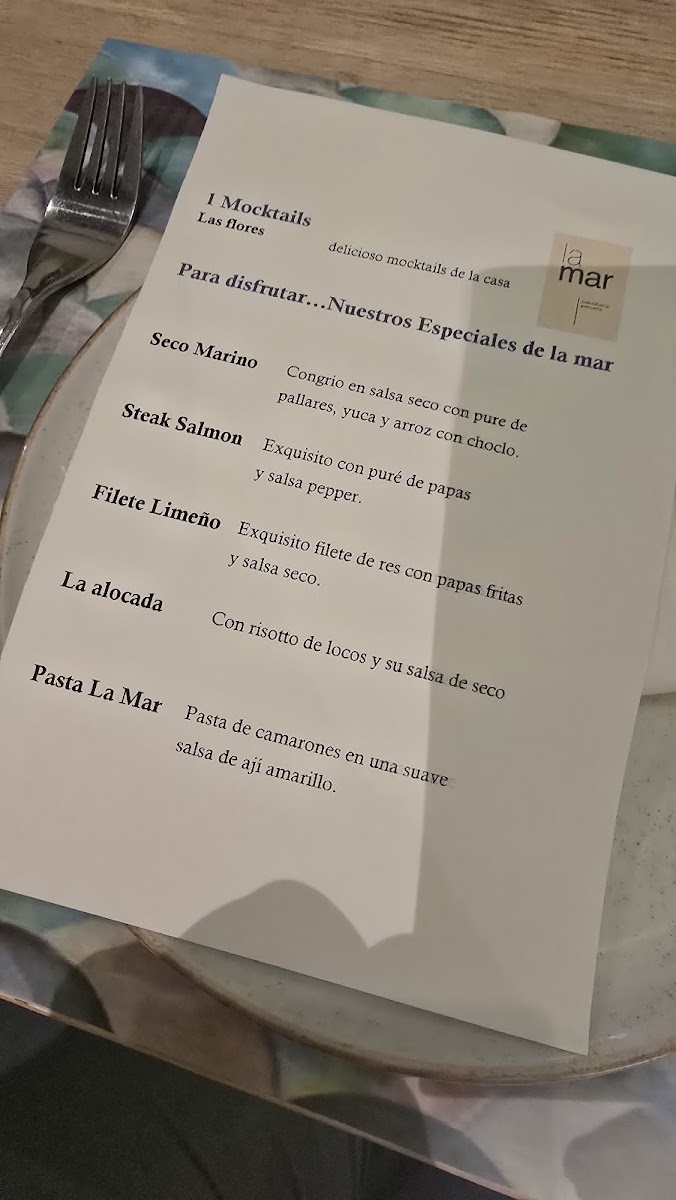 La Mar presents a menu that showcases the best of traditional Peruvian flavors with a modern twist. Start your journey with the exquisite Ceviche de Pescado y Calamar en Leche de Coco, where the freshness of the seafood is enlivened by zesty citrus and creamy coconut milk. For a stunning main course, indulge in the Pescado y Camarones a la Parrilla con Sazonado Peruano sobre Arroz, grilled to perfection and richly seasoned for a smoky, savory delight.